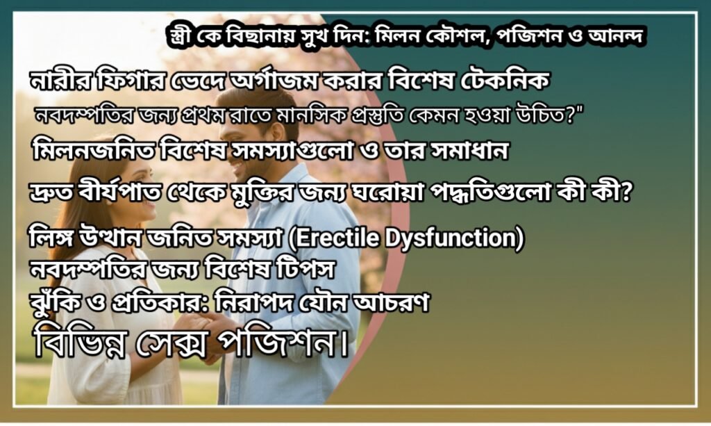* *স্ত্রীর বিছানায় সুখ নিশ্চিত করা:* স্ত্রী/সঙ্গিনীকে শারীরিক ও মানসিক আনন্দ দেওয়ার জন্য কার্যকর *মিলন কৌশল, পজিশন ও টিপস* সম্পর্কে বিস্তারিত ধারণা।
